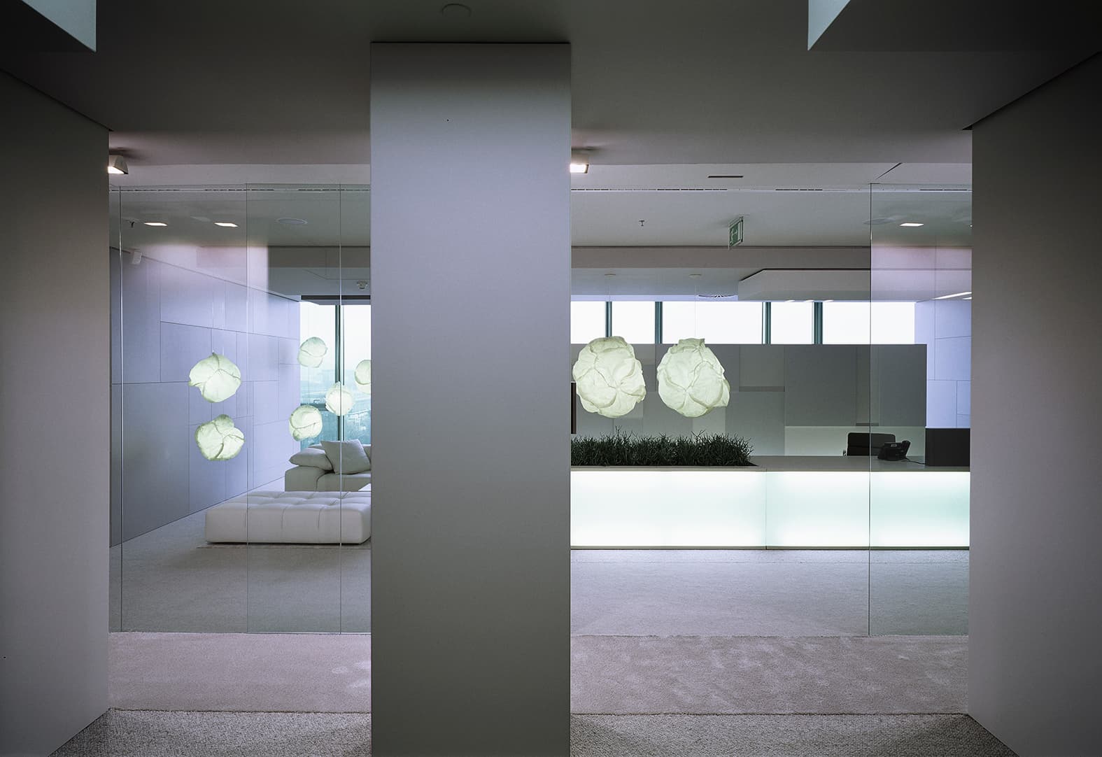 ulazna ostakljena stijena projektantskom je odlukom značajno odmaknuta od zadanog portala generički oblikovane jezgre s dizalima i stepeništem. pozicioniranjem stijene ulaznog pretprostora izvan uvriježene pozicije fizičke su granice pojedinih sektora neočekivano izmaknute i time negirane pa se cijeli prostor doživljava kao jedinstven. strateški predimenzioniranim formatom transparentne staklene površine čija se vrata nečujno kližu dodatno se manipulira doživljajem prostora. negira se izvorni neugledno dimenzioniran građevinski okvir ulaza i stavlja ga se u sekundarni plan doživljaja, a percepcija veličine prostora u potpunosti je promijenjena.