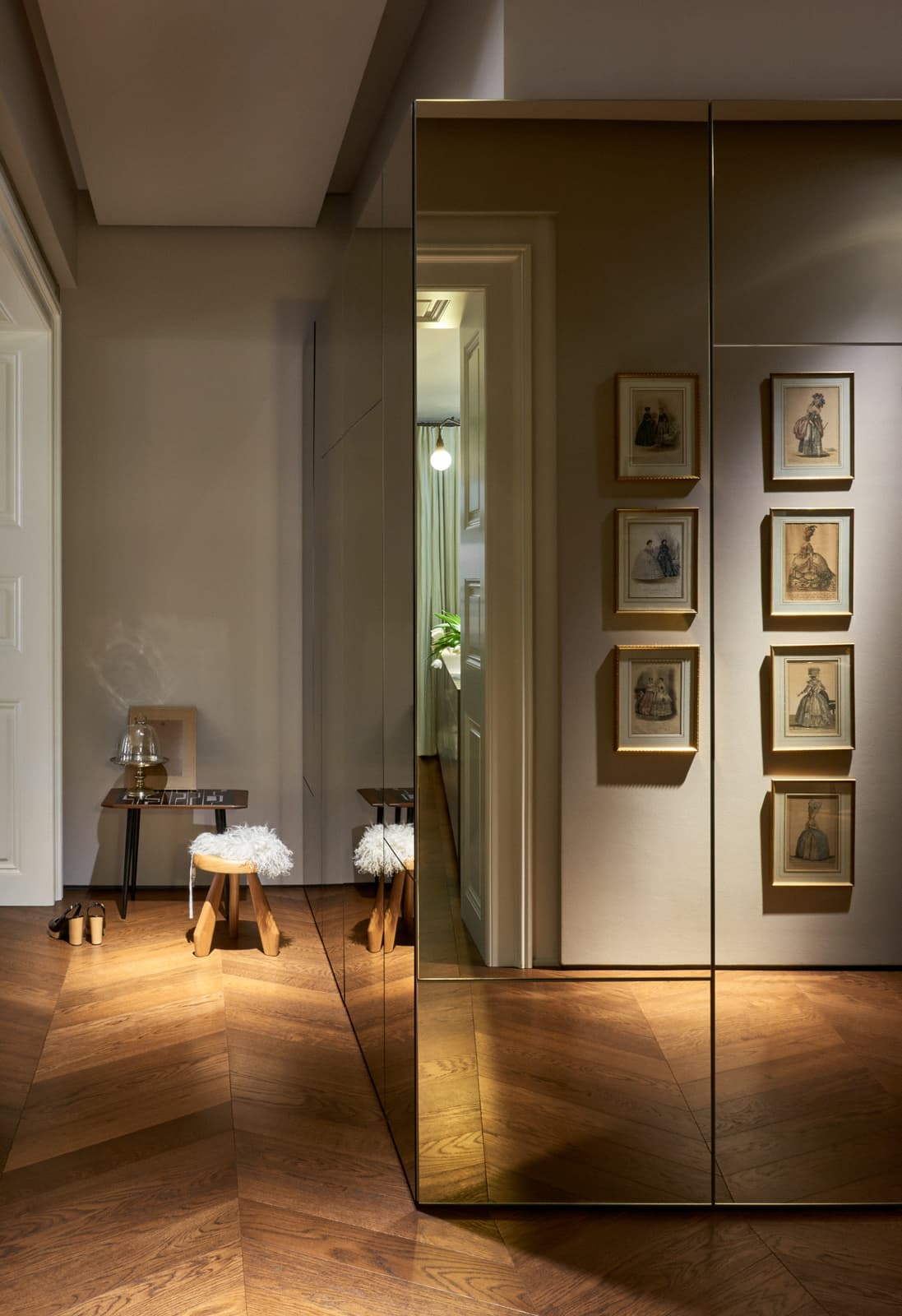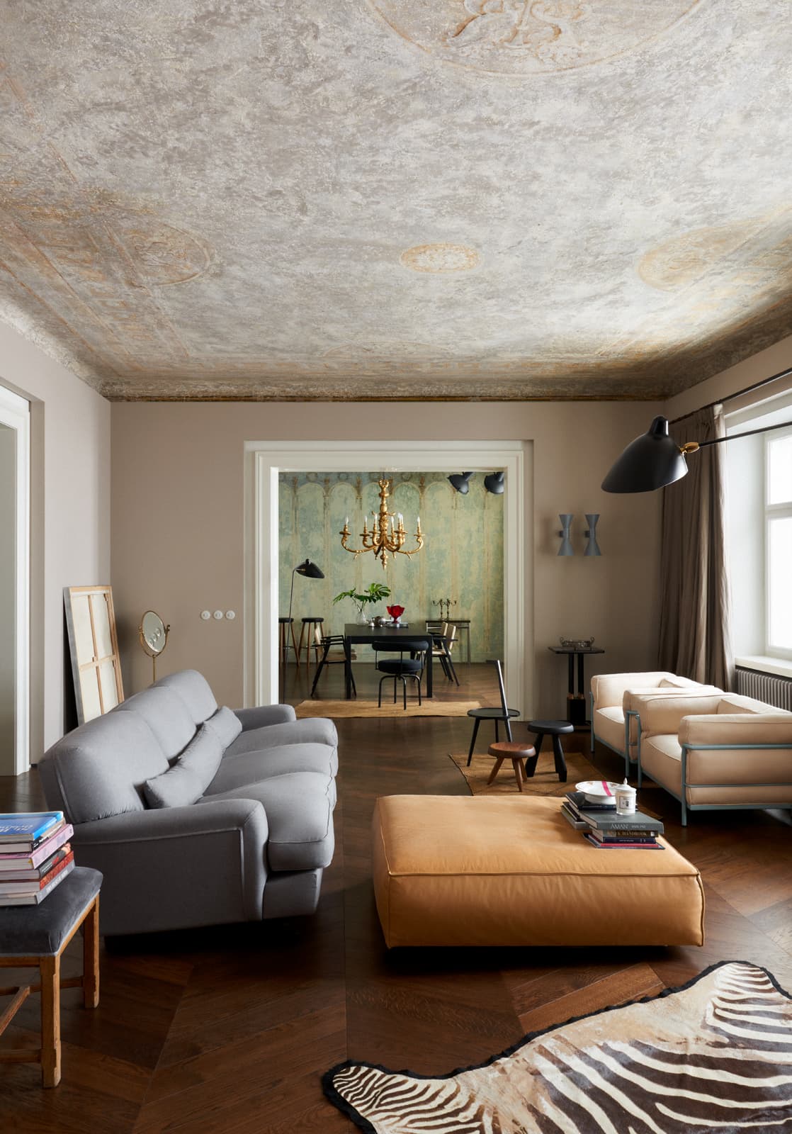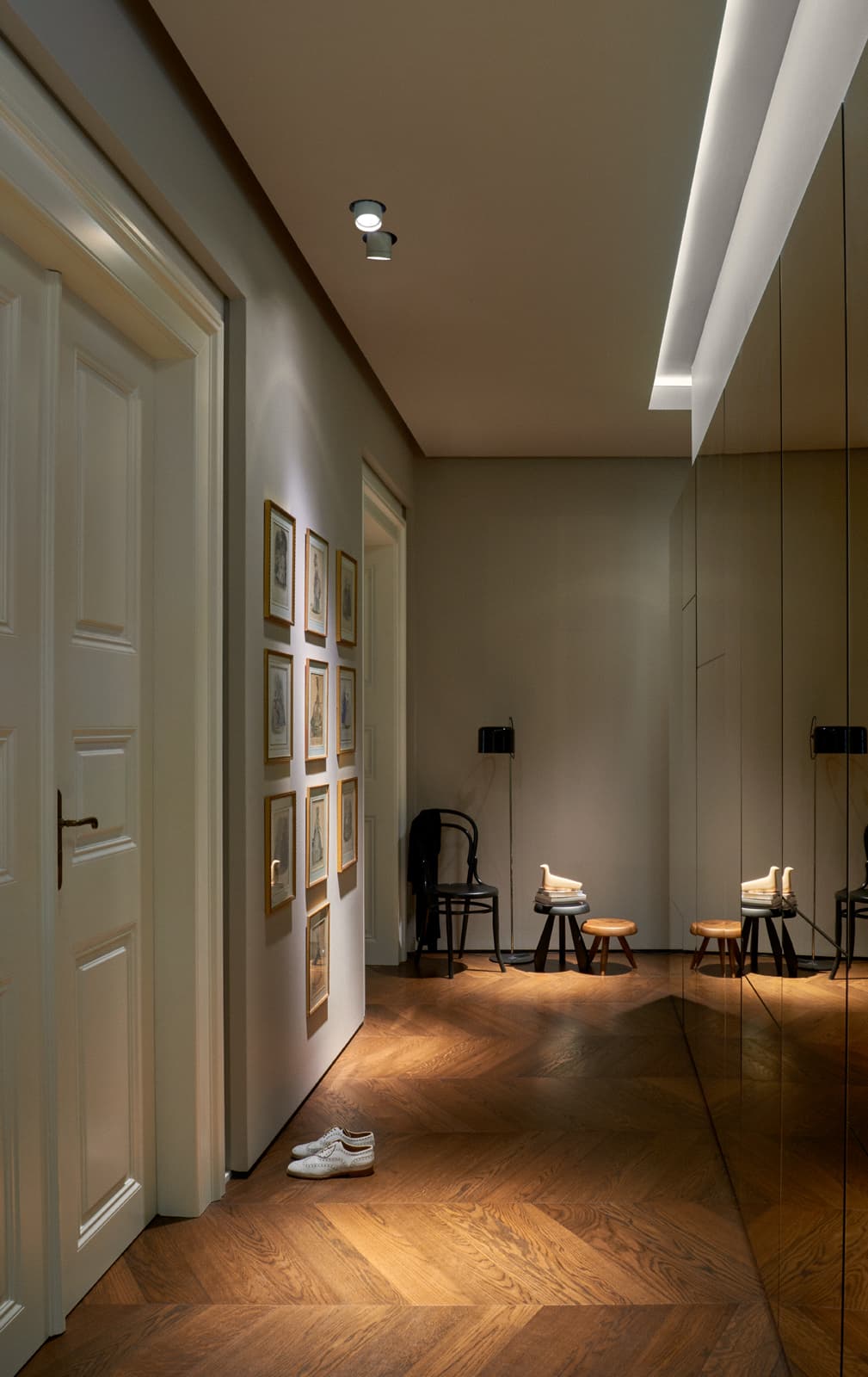 Nizom ispravnih projektantskih odluka očuvana je zatečena tipologija s enfiladom reprezentativnih soba koje su minimalnim intervencijama povezane i objedinjene u jedinstvenu zonu preklapanja dnevnih sadržaja. Ovom otvorenom planu suprotstavljen je utilitarni kubus naglašeno oblikovan kao novonastali element koji spretno skriva instalacijske sustave i utilitarni prostor unutar zrcalne ovojnice. Posebno je upečatljiv pažljivo projektiran odnos restauriranih izvornih oslika stropova i zidova s novim oblogama, uz precizno naglašavanje razlika novog i starog. Rafiniranim, odmjerenim i senzibilnim pristupom oblikovan je slojevit stambeni ambijent koji vješto spaja identitete iz različitih vremenskih epoha u neku sasvim novu autentičnost.