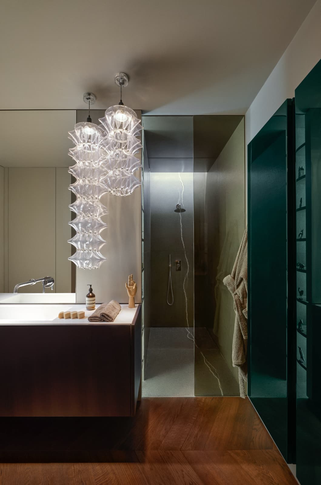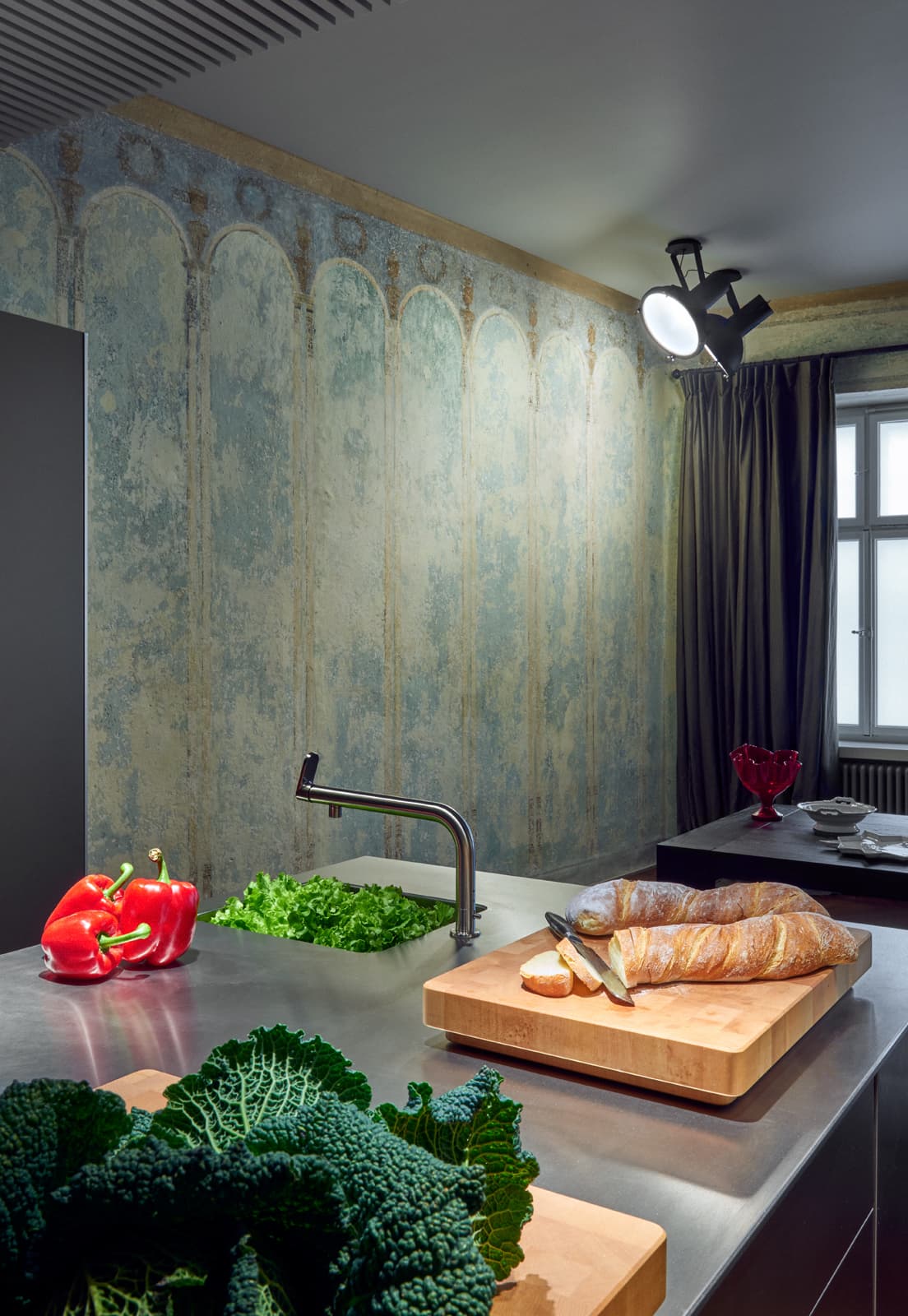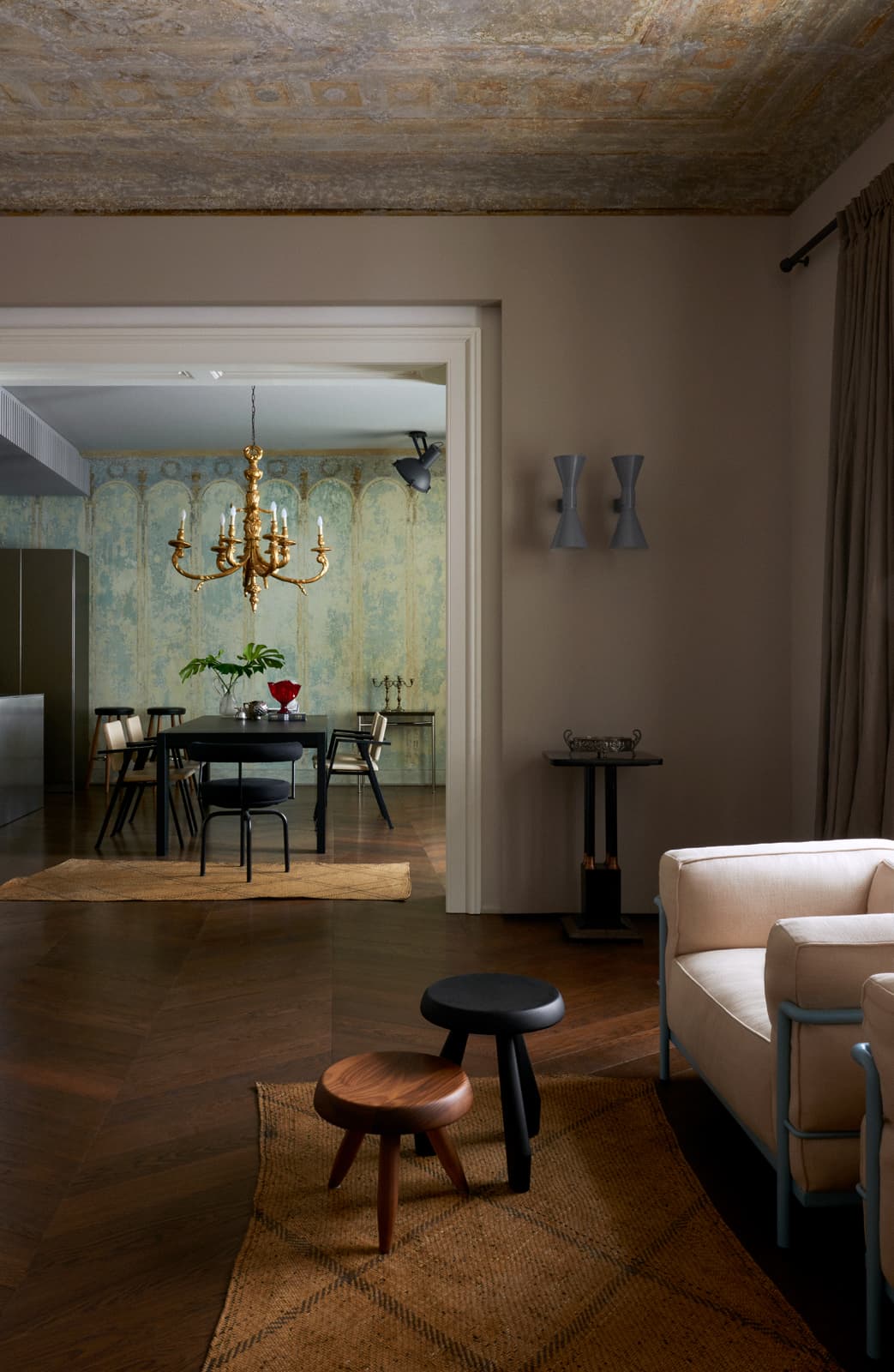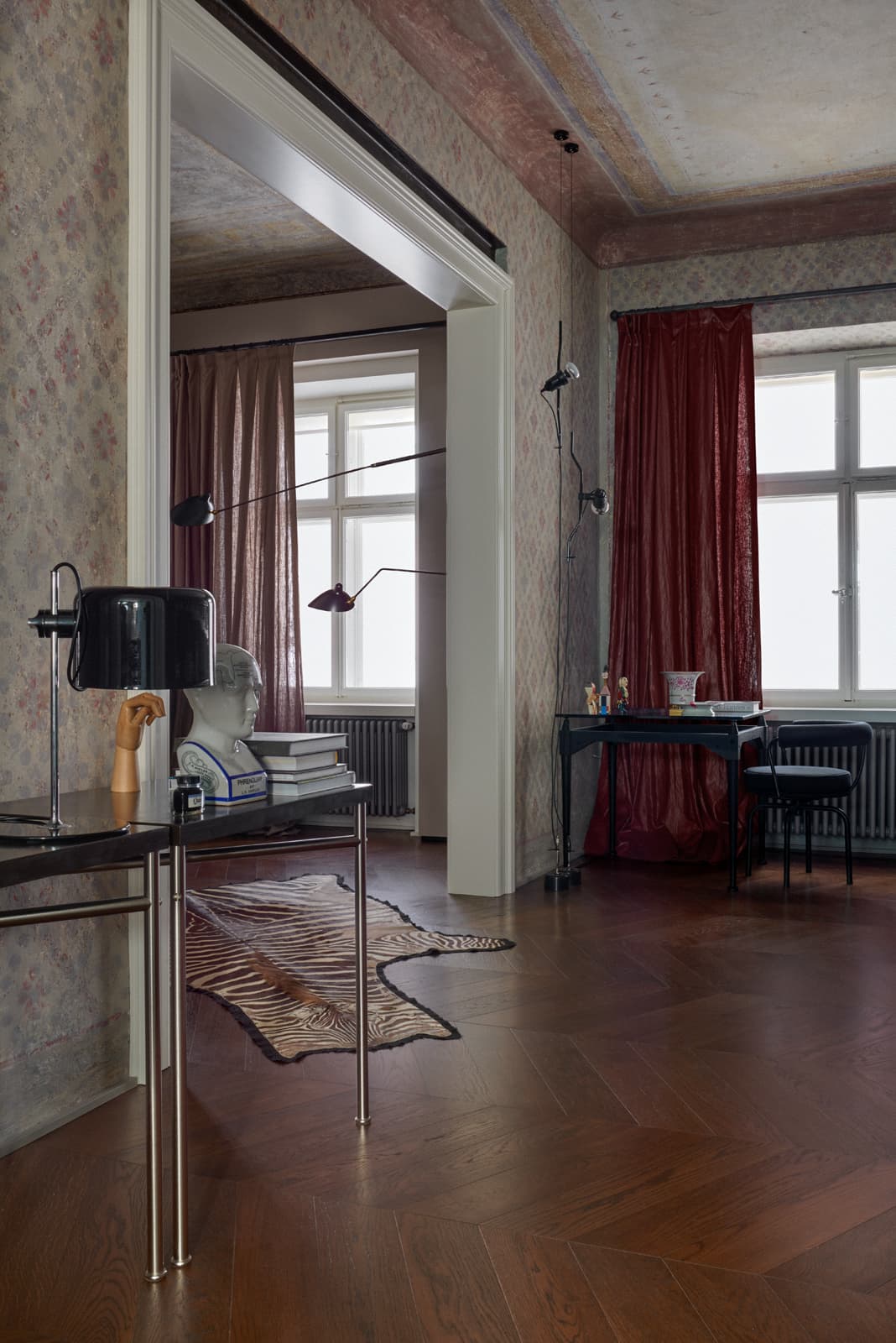 Nizom ispravnih projektantskih odluka očuvana je zatečena tipologija s enfiladom reprezentativnih soba koje su minimalnim intervencijama povezane i objedinjene u jedinstvenu zonu preklapanja dnevnih sadržaja. Ovom otvorenom planu suprotstavljen je utilitarni kubus naglašeno oblikovan kao novonastali element koji spretno skriva instalacijske sustave i utilitarni prostor unutar zrcalne ovojnice. Posebno je upečatljiv pažljivo projektiran odnos restauriranih izvornih oslika stropova i zidova s novim oblogama, uz precizno naglašavanje razlika novog i starog. Rafiniranim, odmjerenim i senzibilnim pristupom oblikovan je slojevit stambeni ambijent koji vješto spaja identitete iz različitih vremenskih epoha u neku sasvim novu autentičnost.