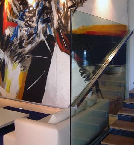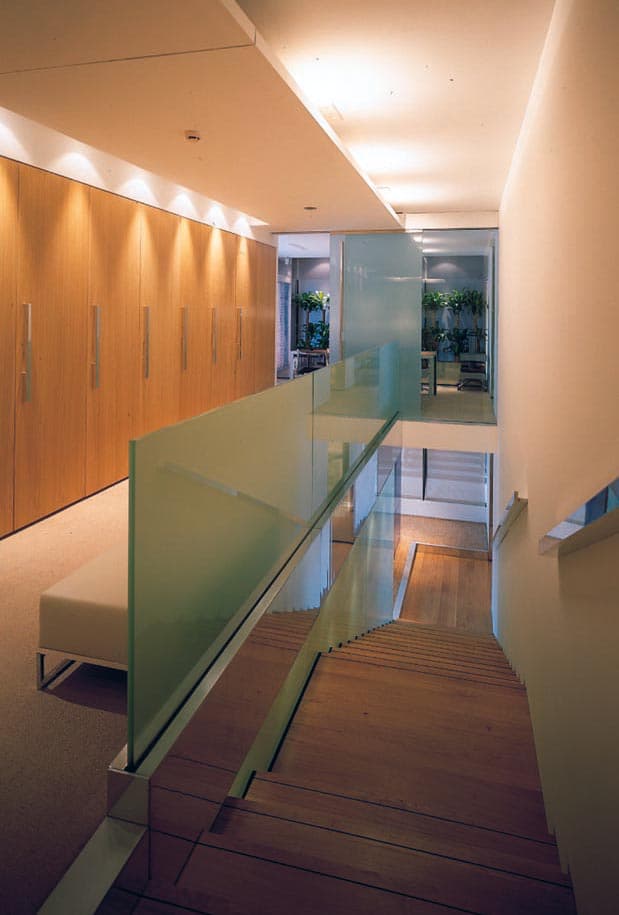 Postavljanjem pjeskarenog stakla na bok stubišta autori osim utilitarnosti rukohvata naglašavaju konturu stubišta i svode je na primarnu shematiku.